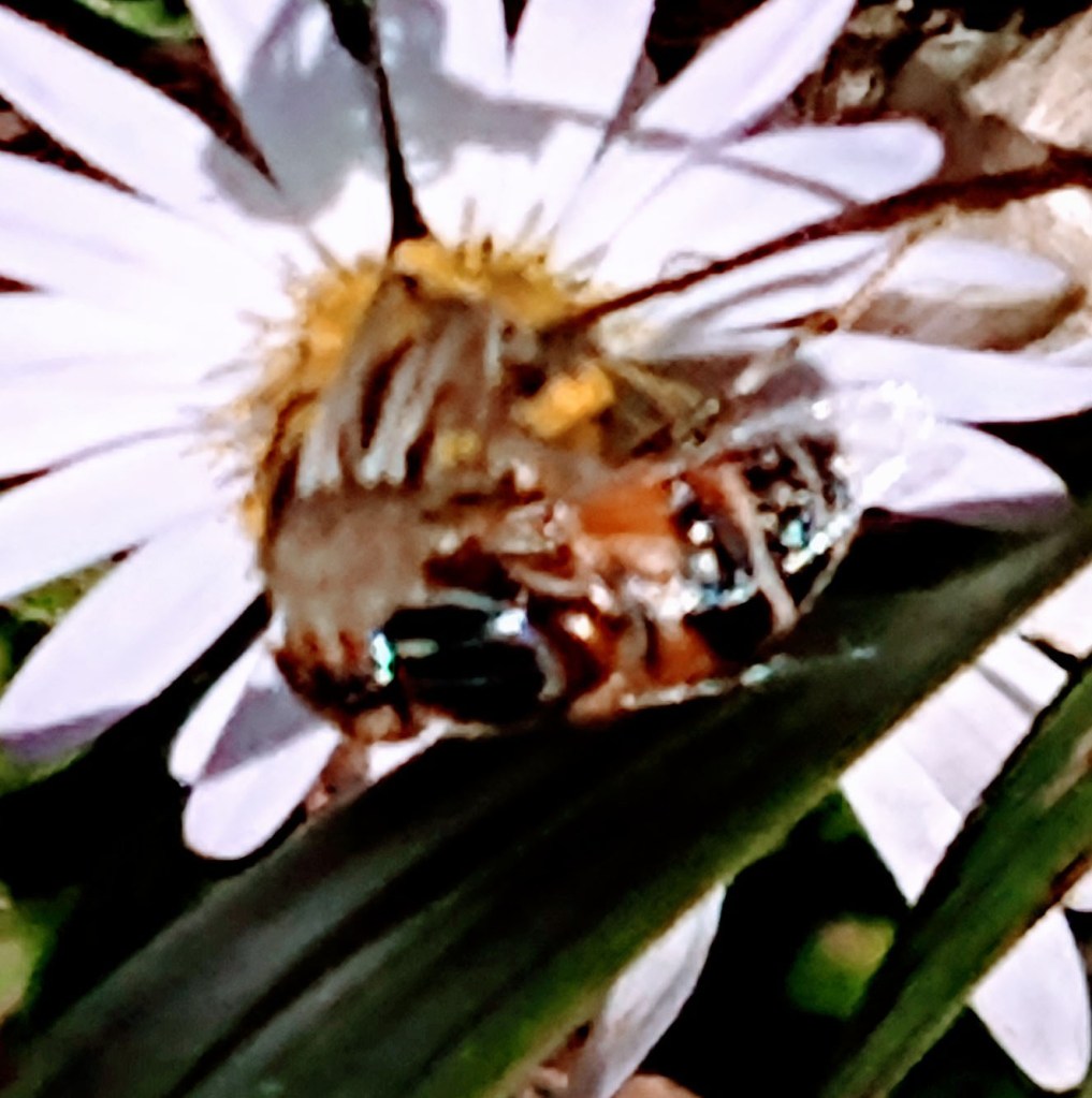 In Japan, Wayne and his wife saw these cuties busily foraging. The first is an Andrena or Colletes (we can’t quite see if there are “eye brows”, aka facial fovae, or not) and the other two are flower flies, perhaps in the Syrphidae Family.