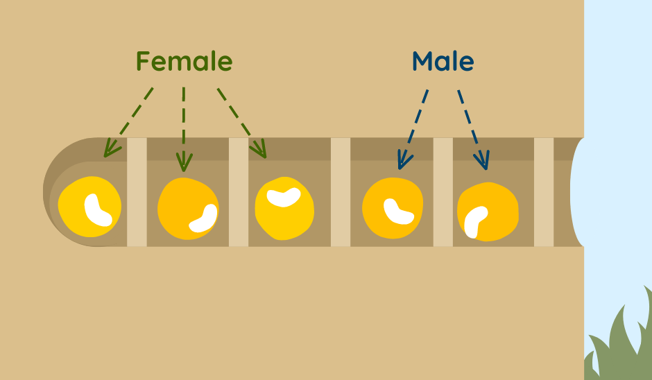 Idealized diagram of a carpenter bee tunnel nest demonstrating egg placement by sex. Yellow circles represent pollen loaves, and white shapes represent larva.