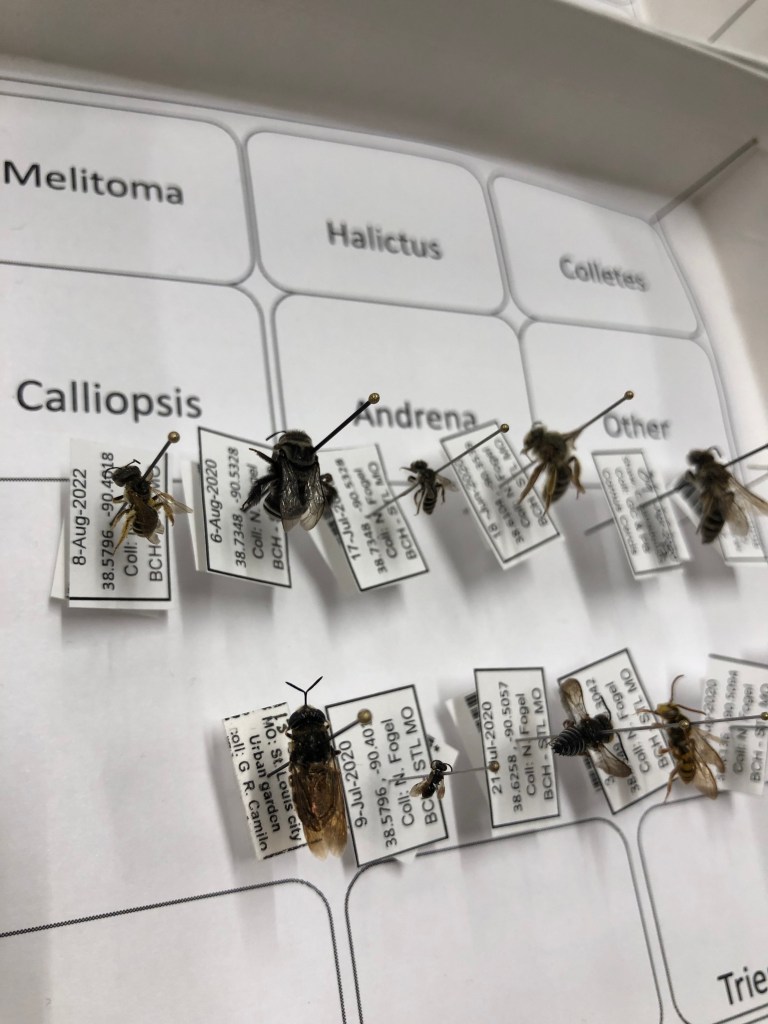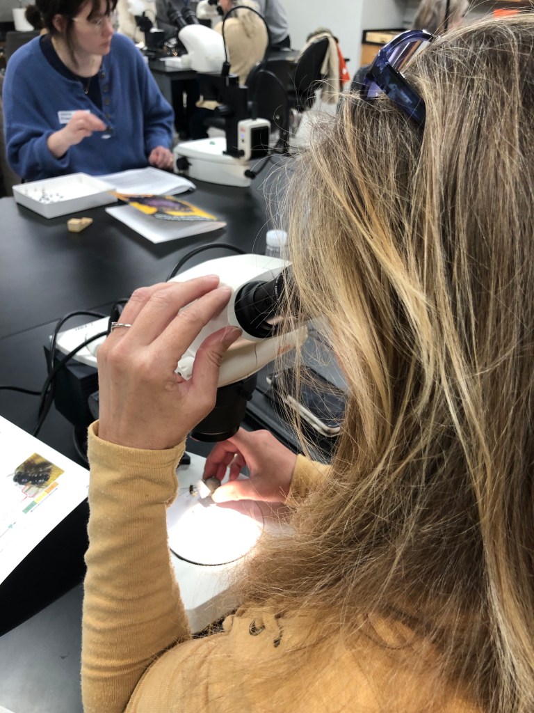 On April 1st, we had a fantastic time having our in-person bee identification course. Over two sessions, 35 people had the opportunity to pin a bee, examine bees under a microscope, and determine what unlabeled specimens were based on the Shutterbee decision trees.