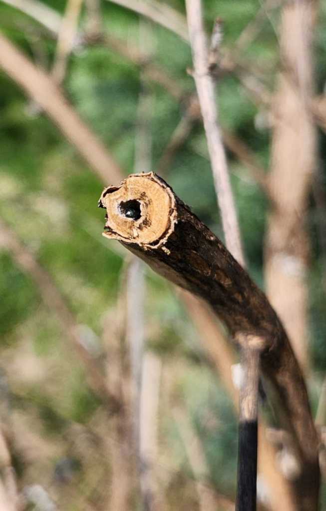 A male small carpenter bee (Genus Ceratina) newly-emerged from a nest in an (invasive) butterfly bush stem, courtesy of Coral Martin. A list of other plants that bees will nest in can be found here. While most species in this list are native and non-aggressive, a few species (highlighted in red) are aggressive or invasive. We recommend avoiding those ones.