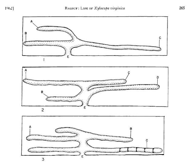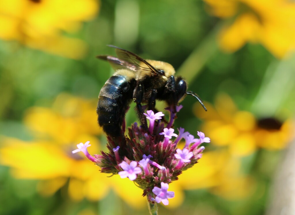 What might truly set carpenter bees apart is… their carpentry! Because these big-bodied bees must chew through a decent bit of wood to accommodate their large offspring, carving out nests takes quite a bit of energy and effort! As a result, pre-established nests are a hot commodity, and females may opt to nest together. In communal nesting sites, younger females often inherit established nests from older females after waiting periods of up to a year.