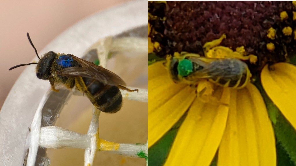 The request: If you notice any bees with small dots of enamel paint on its thorax (usually orange, yellow, or white), please add it to the “Shutterbee Mark-Recapture” iNaturalist project using the steps in the figure below. If you are on your computer, you can also tag us (nicolem42 or hgojohn12) in a comment, and we can add it to the project for you.