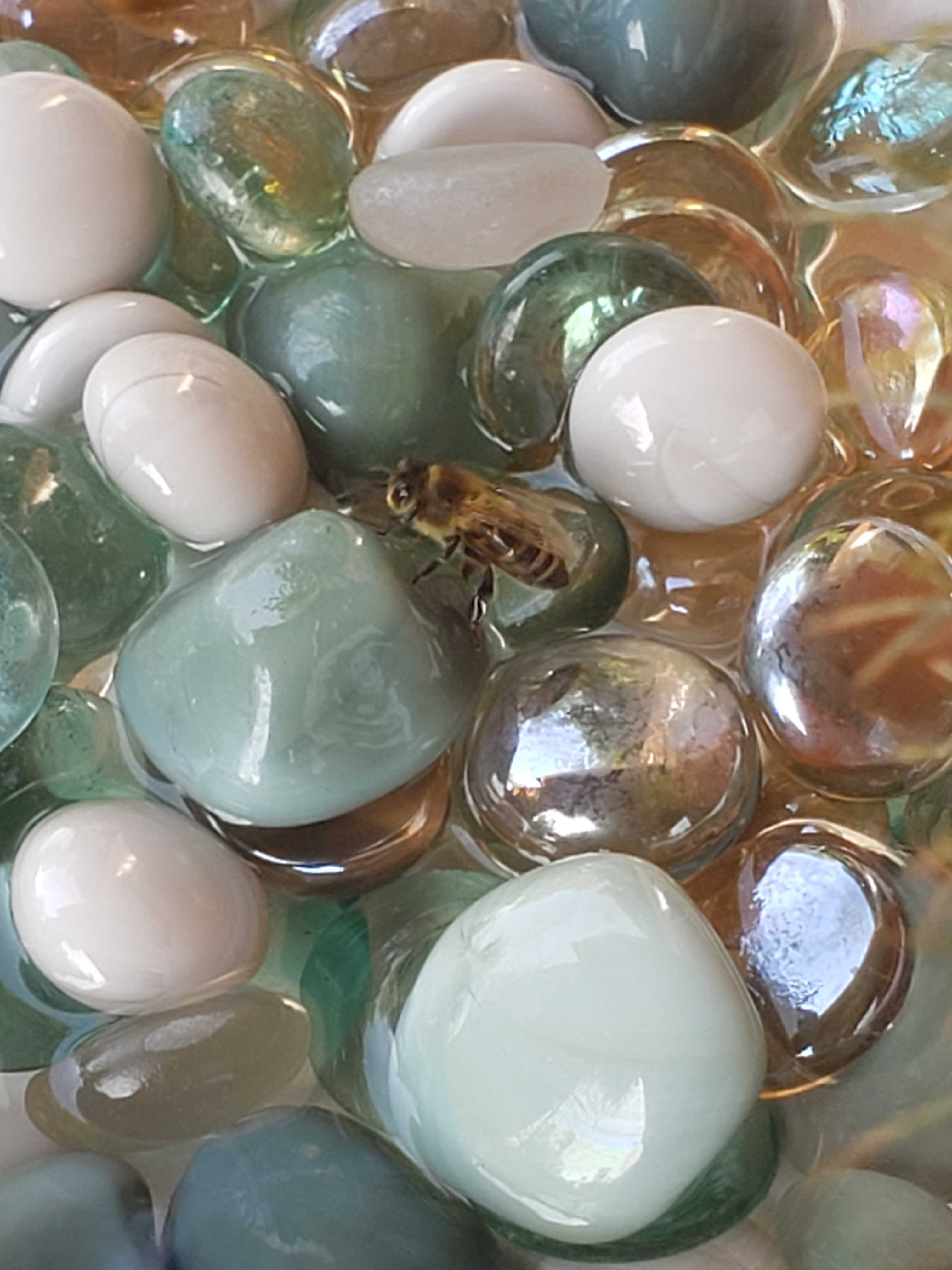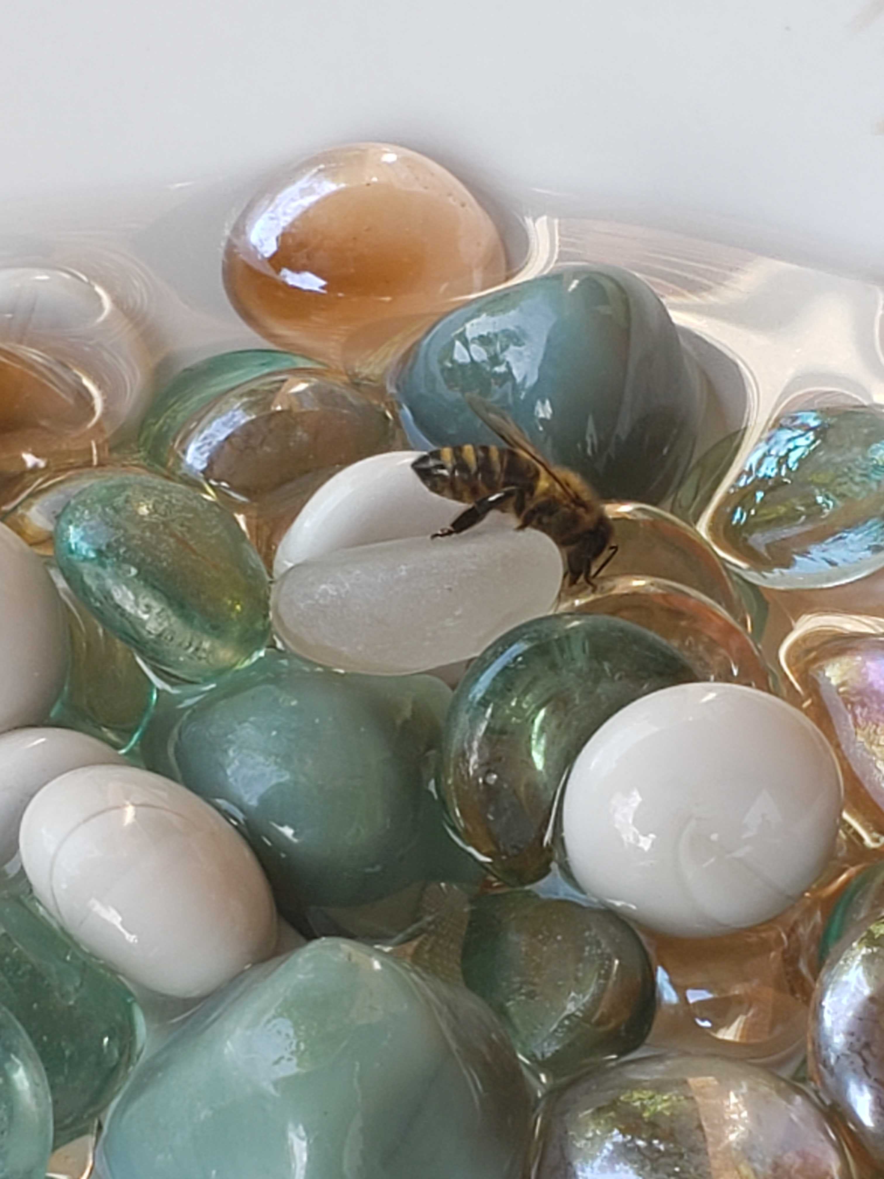 This article has some more information about how the social nesting bees use water in their hives. It also has some cute and easy DIY bee watering stations you could make to keep the bees cool all summer long, like this pebble-filled dish spotted in a Shutterbee participant’s garden: