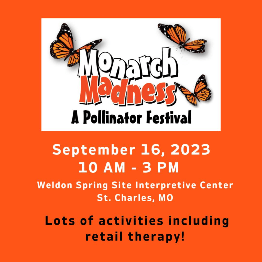 Interested in celebrating non-bee pollinators next month? Monarch Madness, an event hosted by the Missouri Department of Conservation and many other amazing partners, is taking place September 16 at the Weldon Spring Site Interpretive Center. It is free to the public and will run from 10:00 AM – 3:00 PM! There will be vendors (some with native plants for sale!), food trucks, and other fun educational opportunities. Click here for more information on the event!
