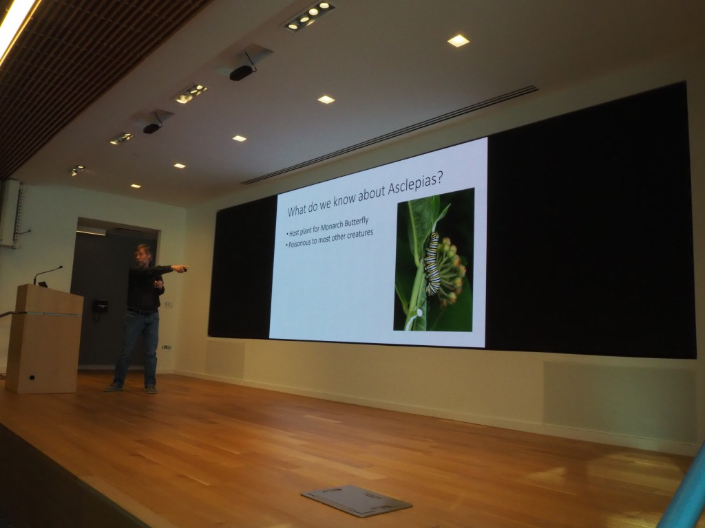 Don LeBaige gave a talk about the different types of milkweed that are native to the area. Although we usually think of milkweed as an important plant just for monarch butterflies, many bees visit it as well. He described the unique pollen structure that milkweed have called pollinia (which are essentially packets of pollen). If the bees aren’t strong enough to pull out the pollinia, they can get stuck to the flowers! Lastly, Don warned against planting tropical milkweed because it causes monarchs to lay eggs that will not have time to develop before winter sets in.
