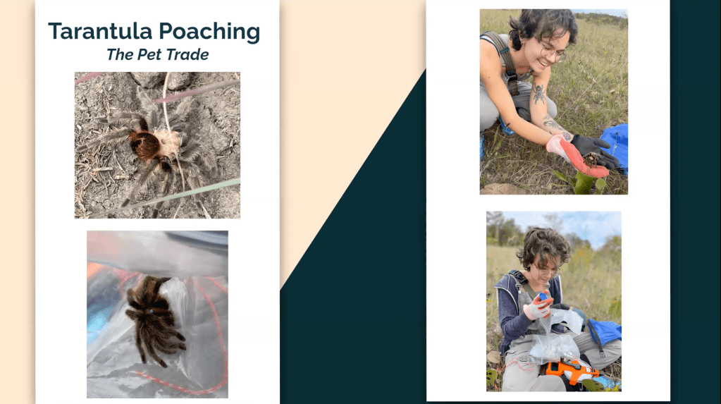 Nataleigh Scheller-Houska is an undergrad at Webster. She presented on Missouri’s native tarantula, Aphonopelma hentzi. This species is relatively docile, slow moving, and have venom that isn’t life threatening. However, these critters can still defend themselves! They have urticating hairs that are sharp as shards of glass that they can flick off when threatened. She spoke about how keeping tarantula as pets can increase conservation effort by building awareness but also there are bad actors that poach tarantulas from the wild.