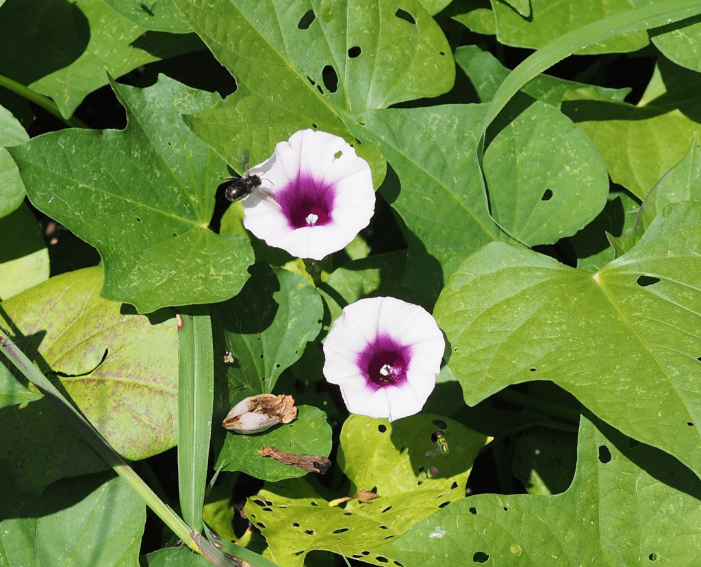 An interesting fact about sweet potatoes is that they are not actually potatoes! While they hail from South America just as “real” potatoes do, they are in the morning glory family (as oppose to nightshade family). Many different native bees visit this fall crop, such as this two-spotted longhorn bee: