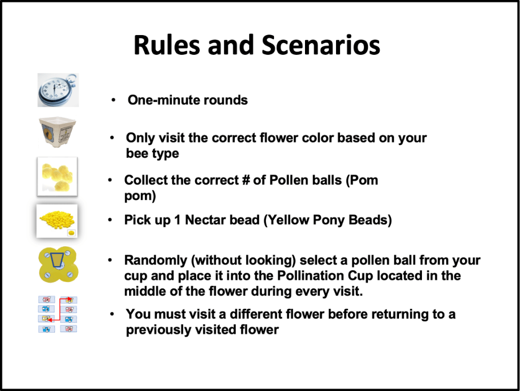 Activity 2 is a game where students act as bees pollinating plants. They have to quickly visit flowers, competing for the available pollen and nectar resources before they are depleted, to survive. Students simulate what happens when when a specialist sunflower bee goes extinct and graph their results.